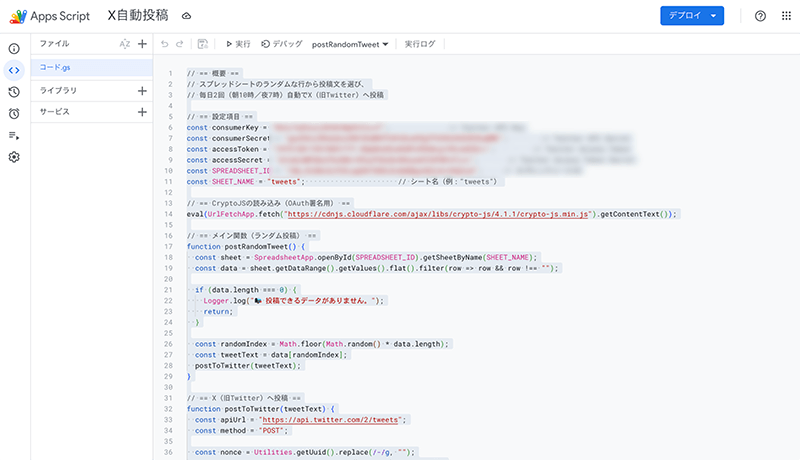 OAuth 1.0aによる署名処理にはCryptoJSをCDNから読み込み、API認証と投稿処理をGASだけで完結。