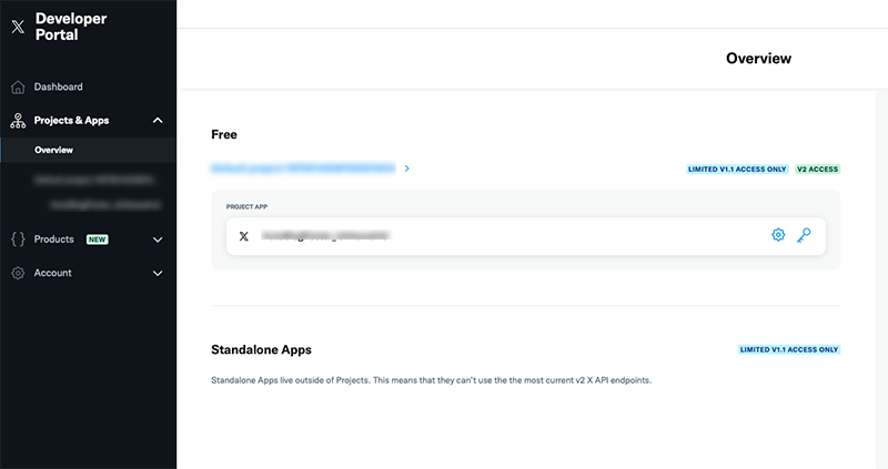 1. 「Projects & Apps」から作ったアプリを選択し、上部タブの Keys and tokens を開く