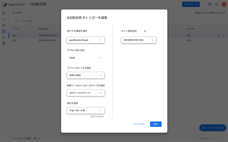 それぞれ postRandomTweet() 関数を実行するようトリガーを設定しておくだけ。