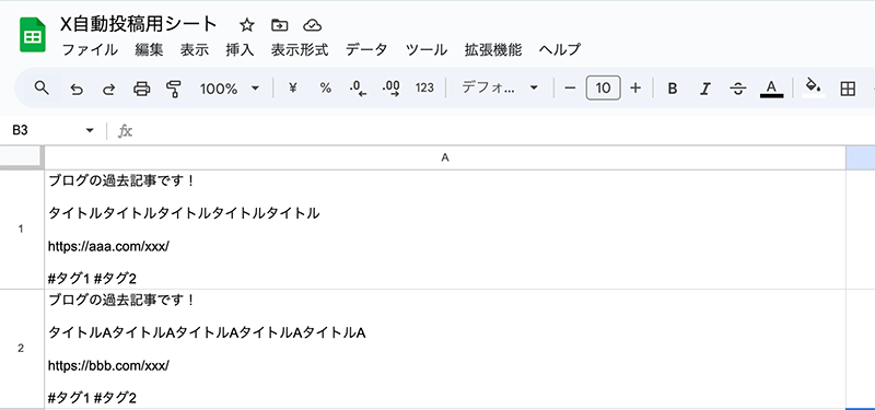 スプレッドシートに投稿文を1行ずつ並べておくだけでOK。