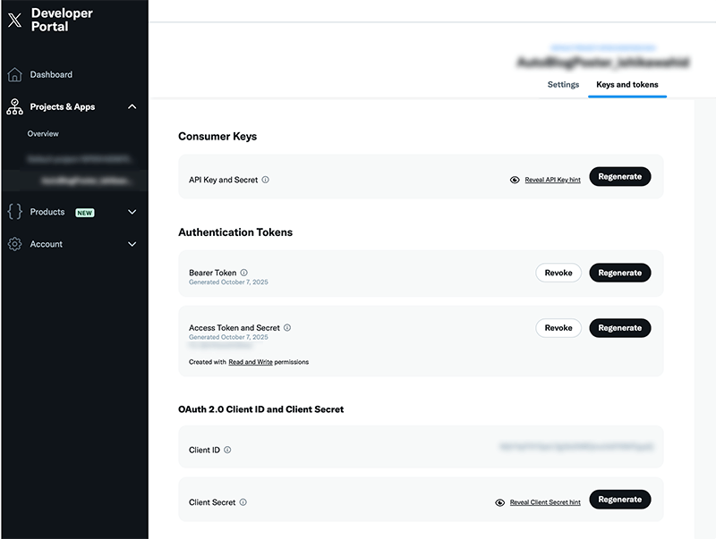 App Permissions(Read Only → Read and Writeなど)を変更した場合は、Access Token / Secret を再発行する必要がある。